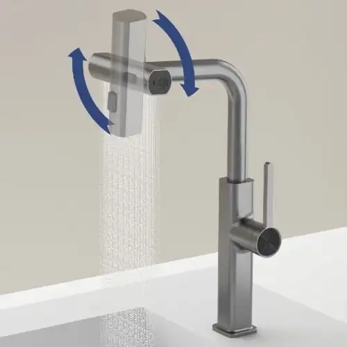 This kitchen faucet boasts a durable stainless steel construction, ensuring long-lasting performance and resistance to corrosion.