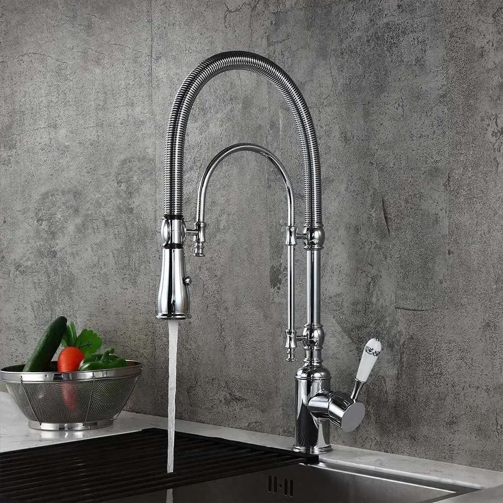Gold Brass Kitchen Faucet Single Handle Dual-Mode Pull-Down Sprayer Kitchen Sink Faucet With Porcelain Handle