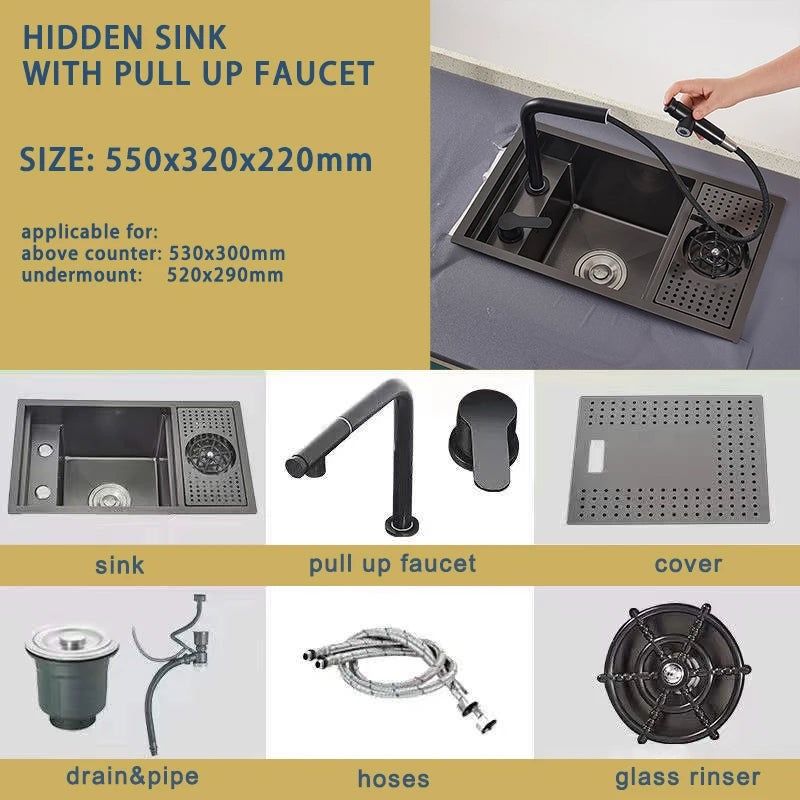Hidden Stainless Steel bar Sink With Glass Rinser