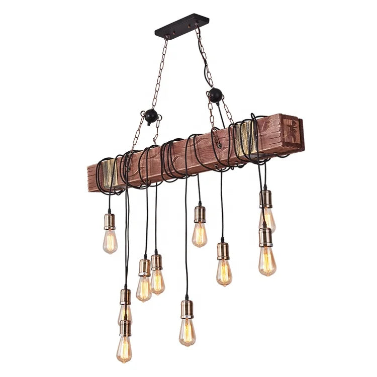 This vintage wood pendant light brings a touch of rustic charm to any dining space. Constructed with industrial iron chains, it adds a unique touch to your restaurant or loft. The wooden chandelier emits a warm, inviting glow, creating the perfect ambiance for your next gathering.