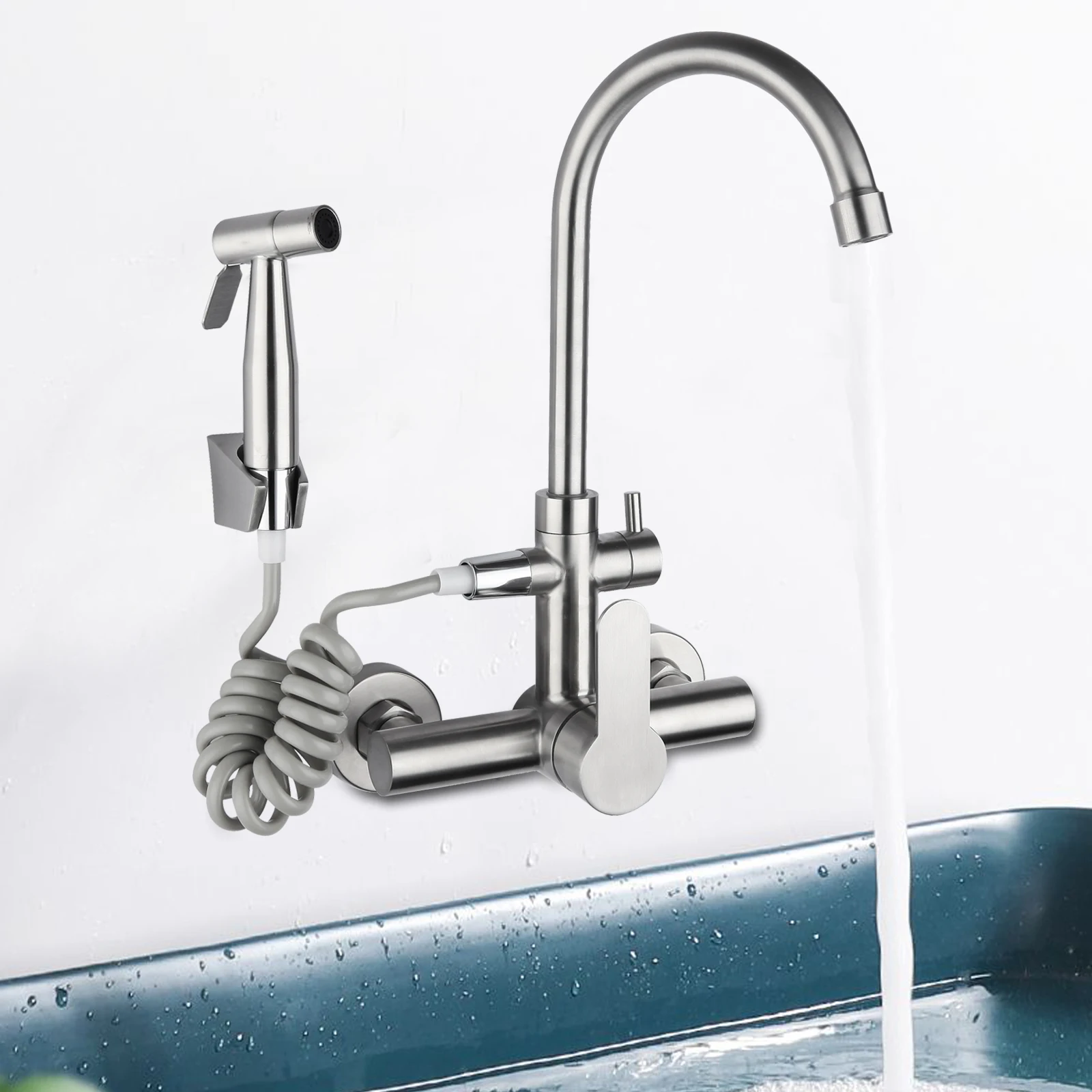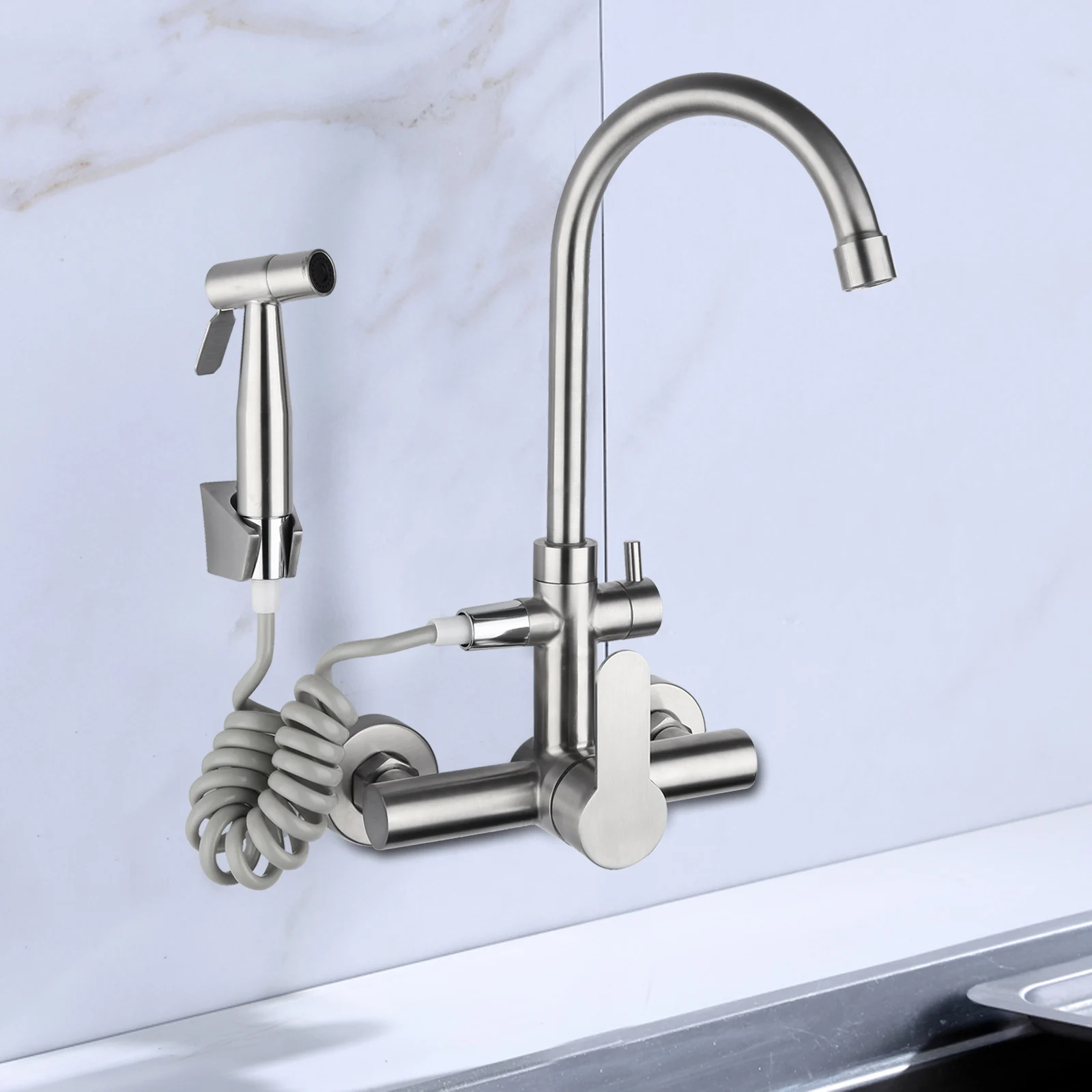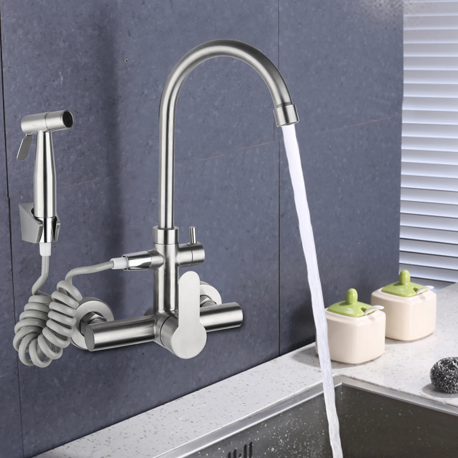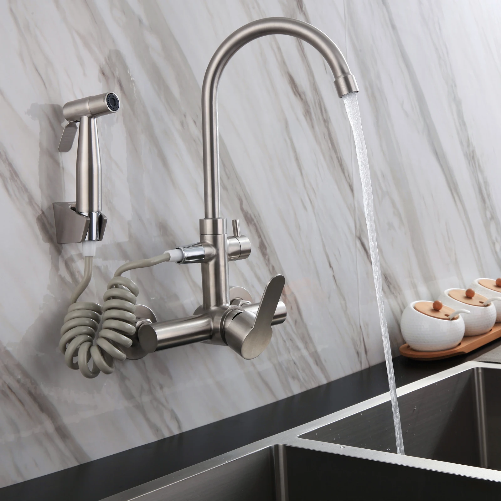 Wall Mount Kitchen Faucet Stainless Steel 360 Swivel Dual Hole Sink Tap Mixer Kitchen Faucet With Bidet Sprayer