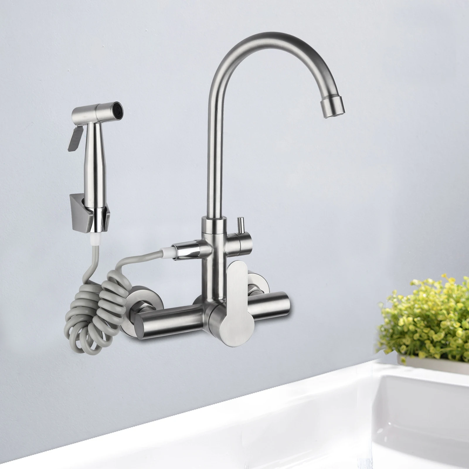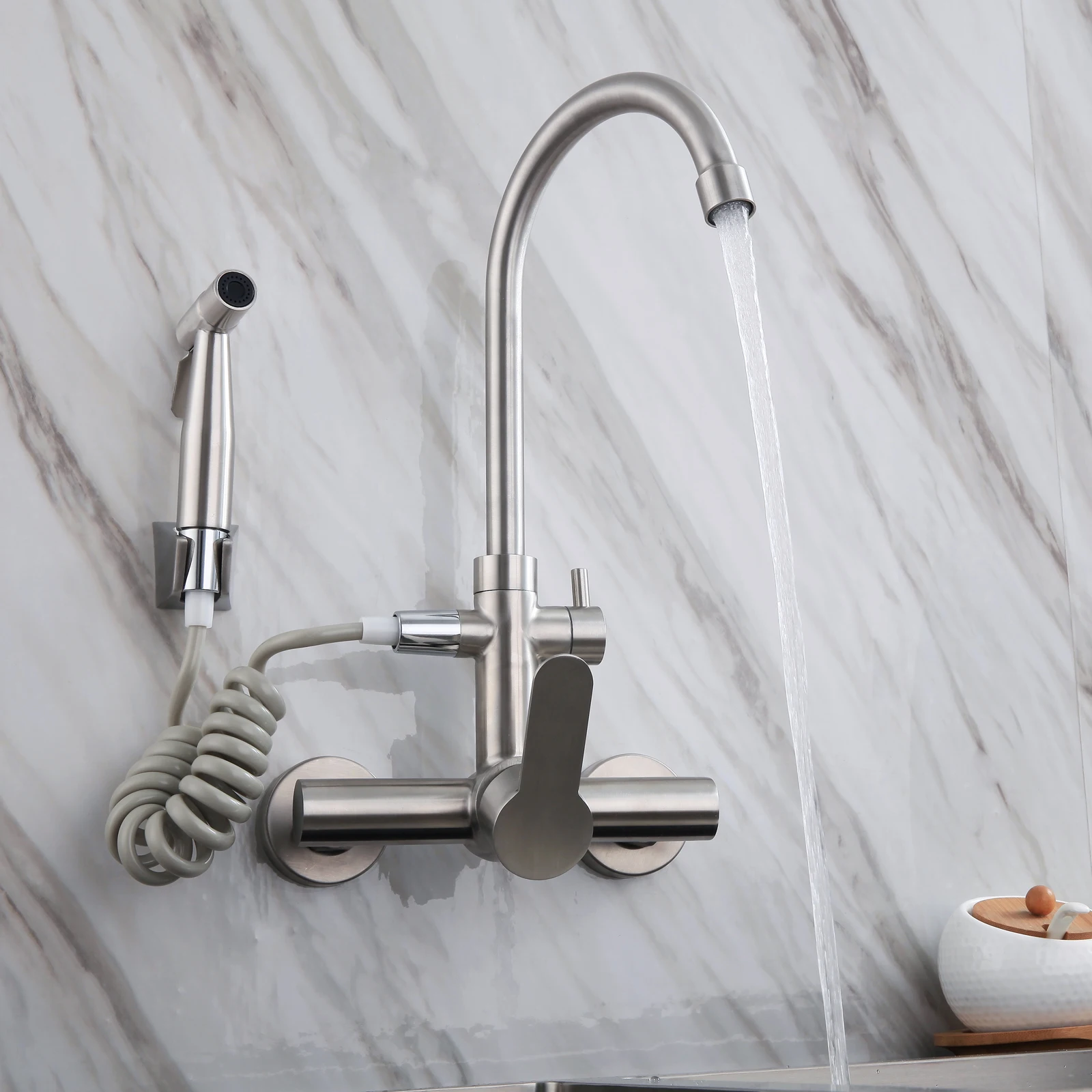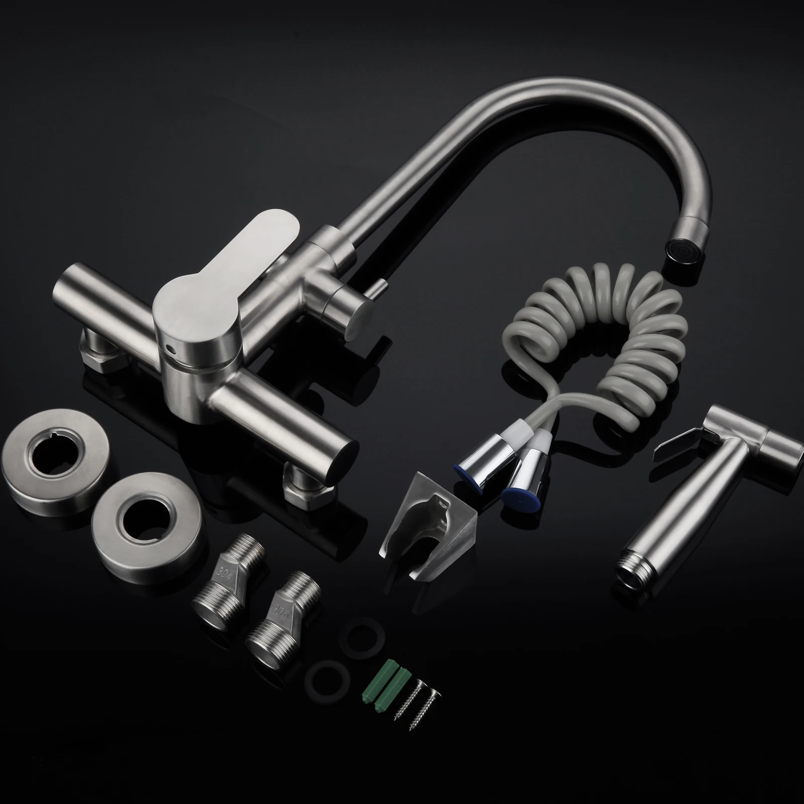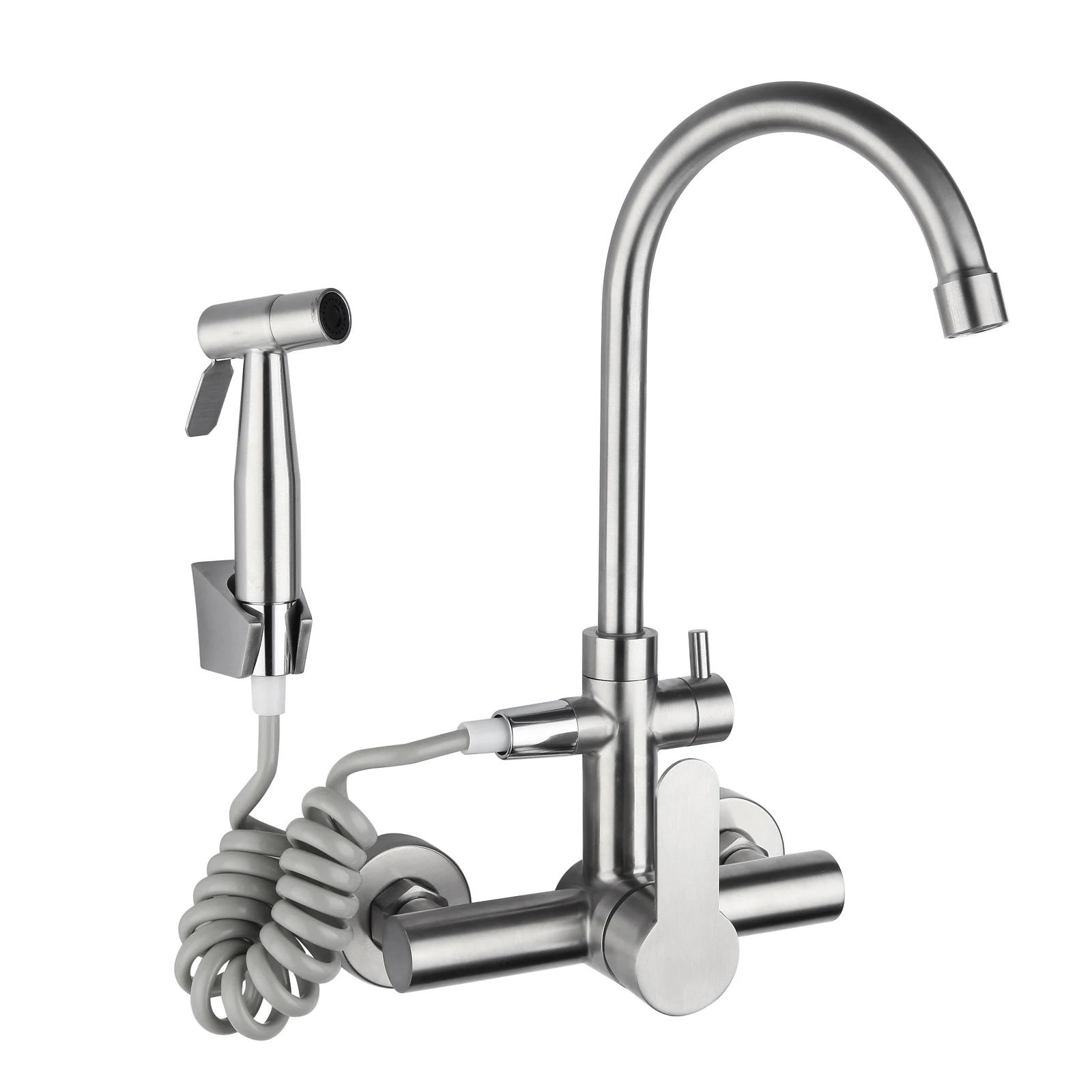 Wall Mount Kitchen Faucet Stainless Steel 360 Swivel Dual Hole Sink Tap Mixer Kitchen Faucet With Bidet Sprayer